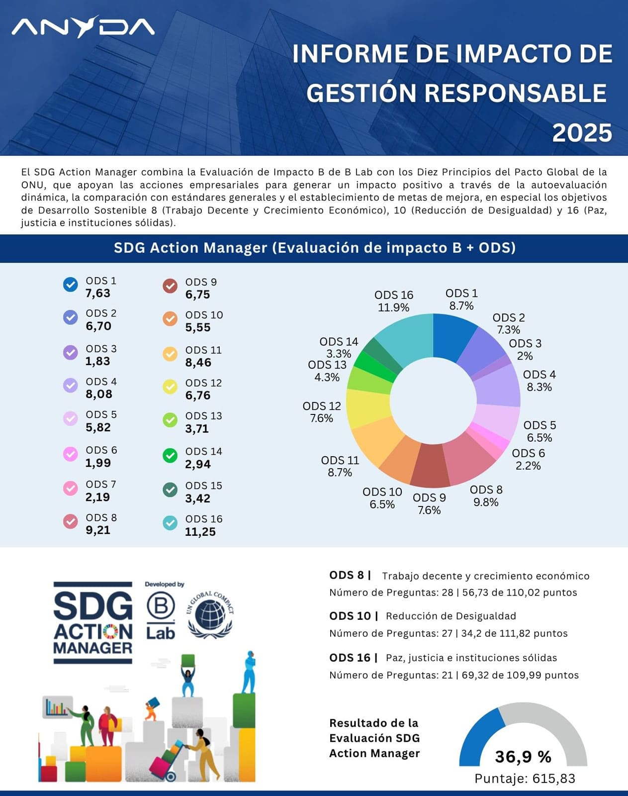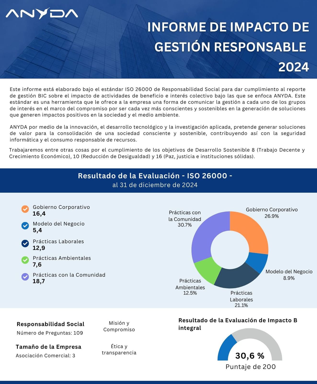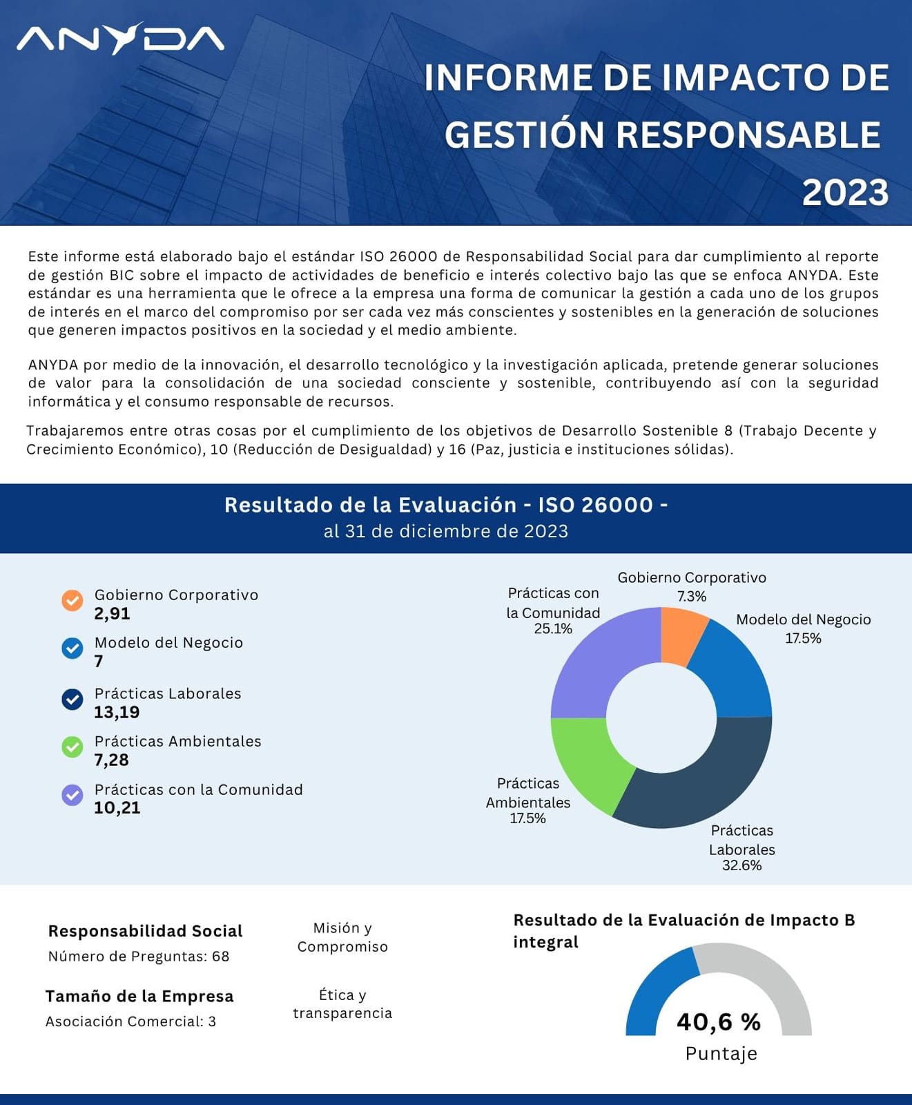 Con base en las evaluaciones se evidencia el compromiso de ANYDA con una gestión responsable alineada a los Objetivos de Desarrollo Sostenible. Los resultados reflejan avances en sostenibilidad, impacto social y mejora continua.